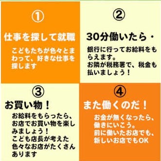 こどものまちのイベント当日、参加者である「まちのじゅうみん」達は、こども店長達が経営するお店で雇ってもらい、仕事をします。仕事をしたら銀行で給料をもらい、税務署に税金を納め、残ったお給料で買い物をしたり、ゲームをしたりと消費行動を行います。
