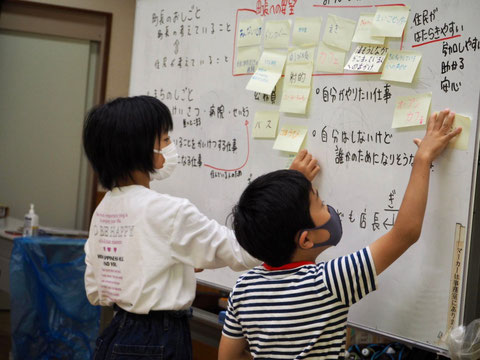 お話を聞いて、みんなで「どんなこどものまちがいいか」を付箋に貼って書いていきます。