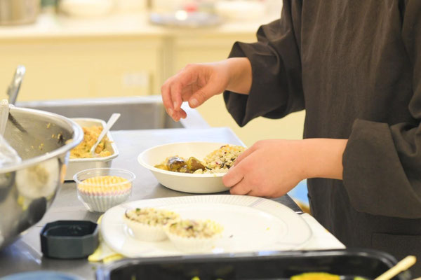 おとなスタッフのお昼ご飯を、キッチンでことことさんが準備中。カレー、60人分!