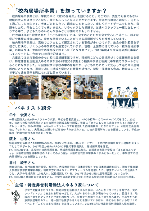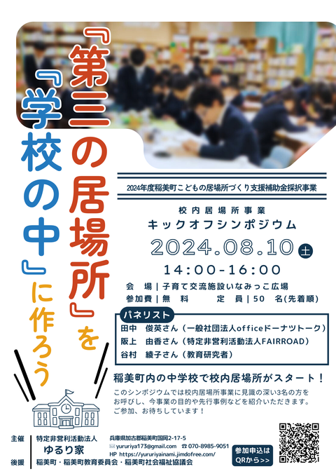 ☆事業スタートの前には、2024年8月10日(土)に校内居場所事業に関する地域の皆さまや行政・学校関係者の皆さまの理解を深めていただきたいと、校内居場所事業に見識の深い三名の方をお呼びして、シンポジウムを開催しました。