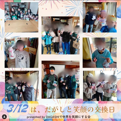 3月12日は「だがしの日」。岡山県の一般社団法人「DAGASHIで世界を笑顔にする会」さんから頂いた駄菓子を子ども達にプレゼントし、だがしと笑顔の交換を行いました。